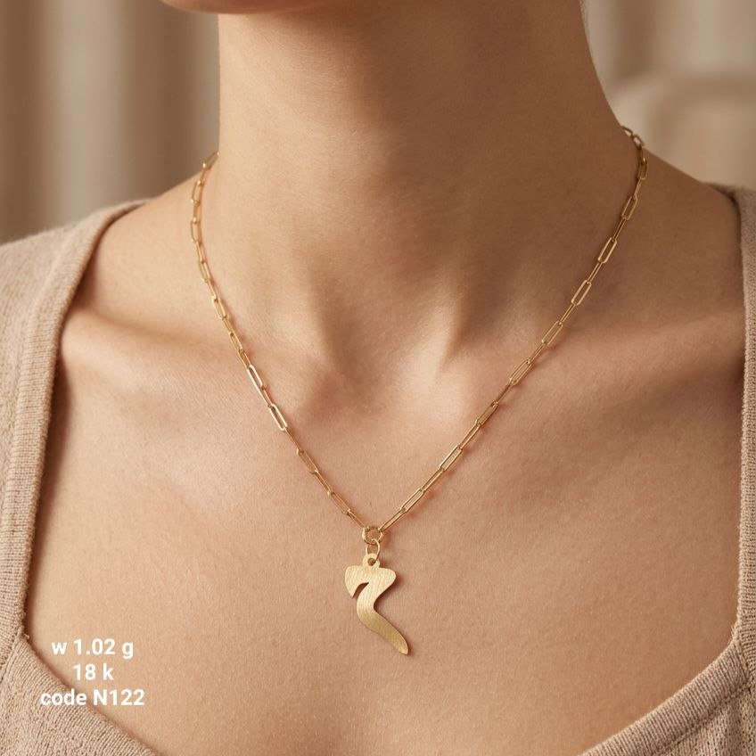 سلسلة ذهب عيار 18 بتصميم “حرف ر” الانسيابي المبدع. قطعة فنية ناعمة جداً تدمج بين الروح العربية والستايل العصري، بوزن خفيف 1.02 جرام.